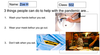 | 1.學生能表達臺灣對於世界其他國家防疫的貢獻。 2.學生能體會臺灣在公共衛生安全上被國際孤立的處境。 3.學生能使用Google Slides製作宣導防疫措施的海報。 |