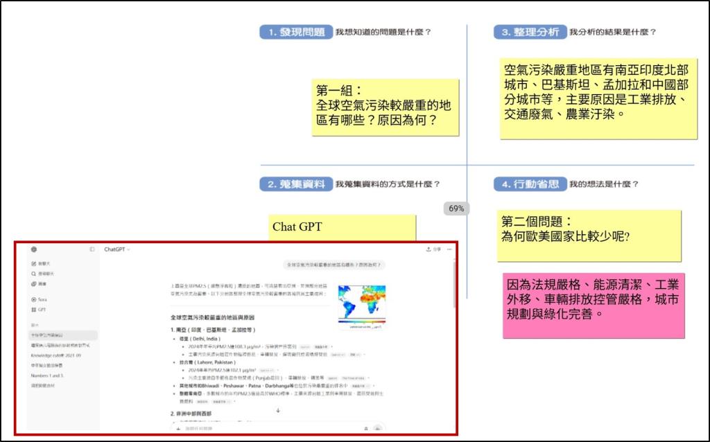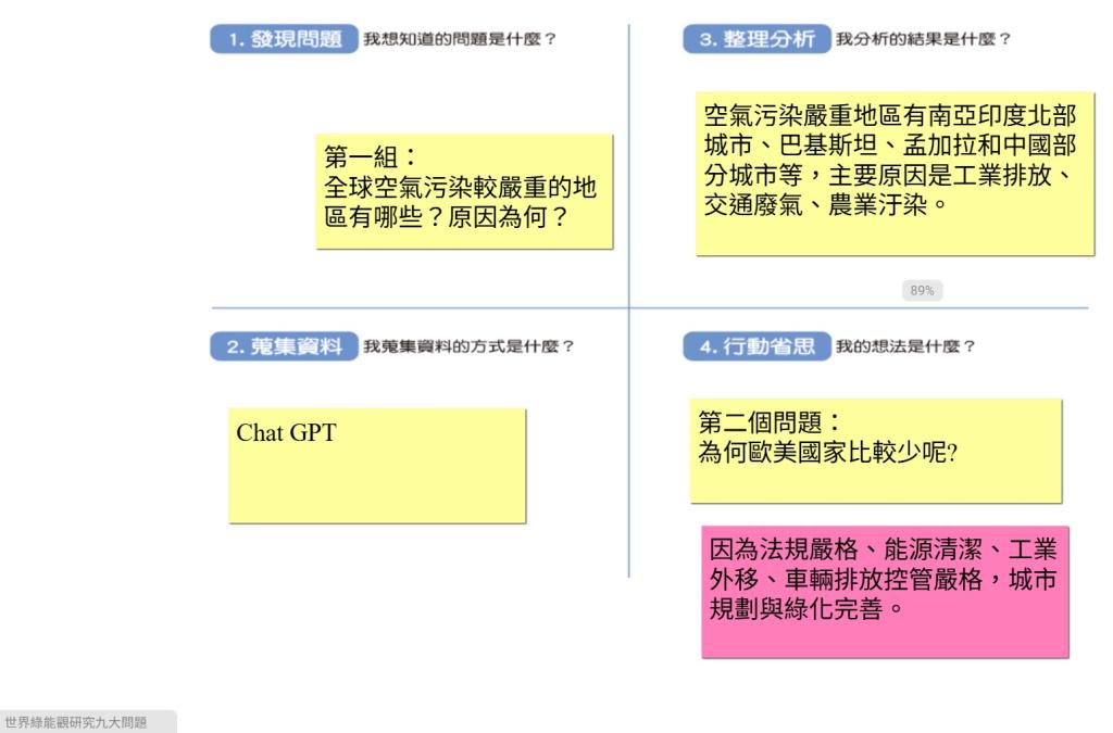 學生透過科技的資訊,發現並回答全球「空氣汙染」分布,並且嘗試回答國家發展、能源使用情況的問題。