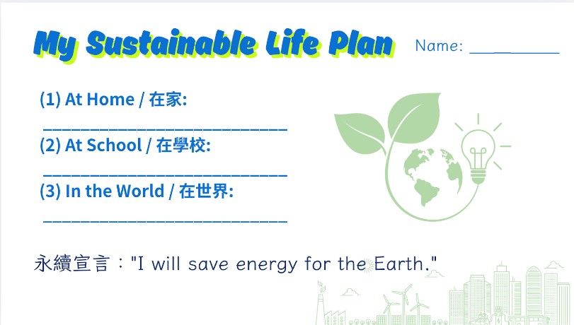 - 全班宣讀永續宣言:"I will save energy for the Earth."
