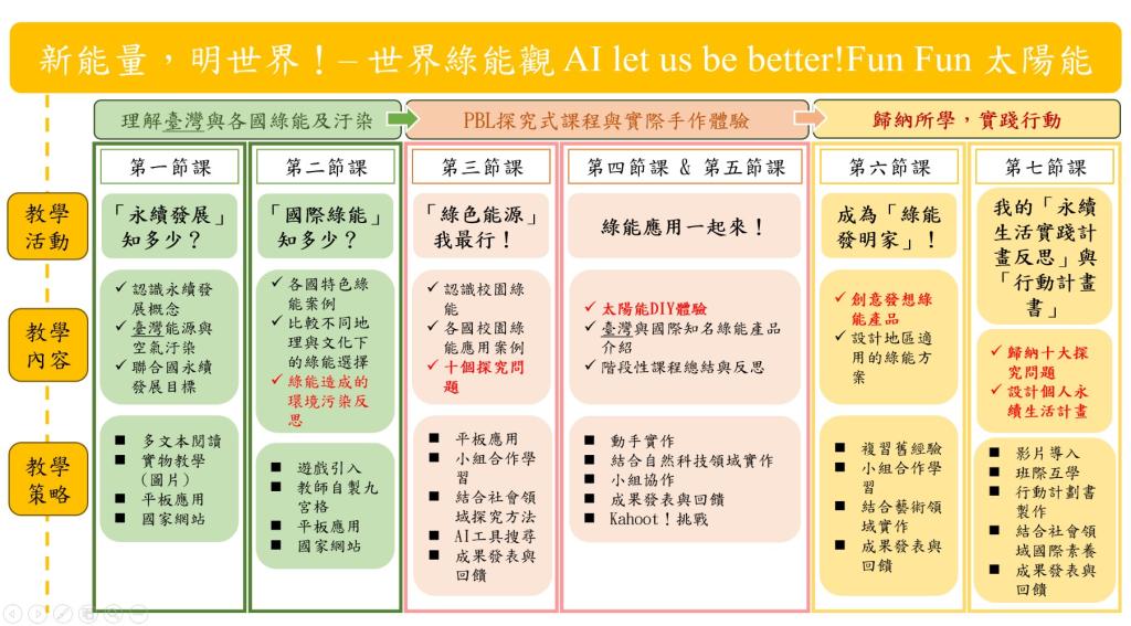 從日常生活中會遇到的新明國小校園太陽能板觀察,到製作綠能小發明,再到設計環保生活方案,學生透過實作、討論與繪畫設計的「問題導向學習模式」(Problem-based_Learning_Model,PBL),落實創客精神,不僅能夠理解綠能轉化成動能的原理,也能透過探究、體驗與合作的方式,培養解決問題的能力與創新能力。同時,本課程也透過國際案例、影片與閱讀資料,讓學生除了能夠認識臺灣的能源與環境現況外,也能比較不同國家的綠能政策與永續實踐,培養學生對全球議題的關注與思辯能力,並且體會每個人的行動對地球永續的重要性。