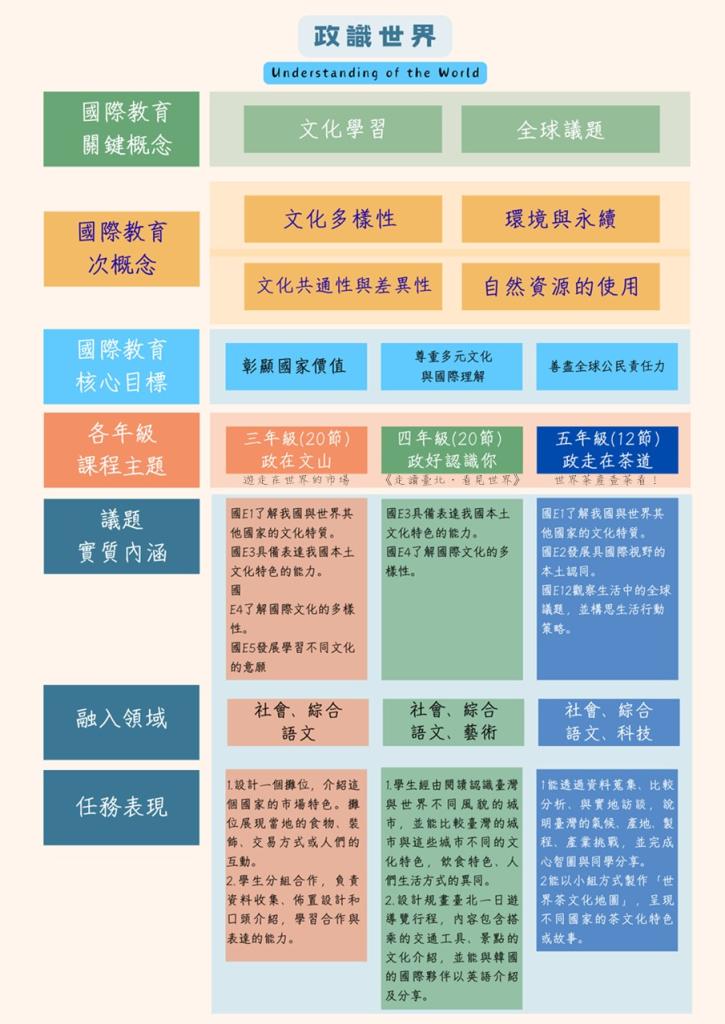 「政識世界」以「多元、優質、創新」為願景,結合「文化學習」及「全球議題」兩大國際教育主軸核心,引導學生探索在地與全球發展議題,由三至五年級循序漸進地探究。